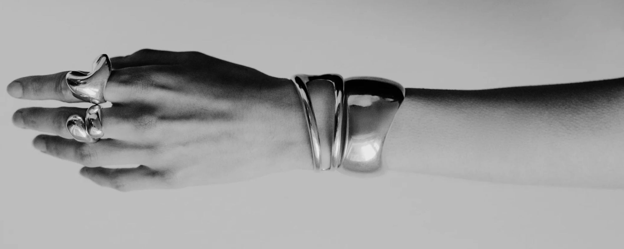 AGMES 0.925 sterling silver sculpted abstract cuff set.Person wearing AGMES 0.925 sterling silver sculpted abstract cuff set.