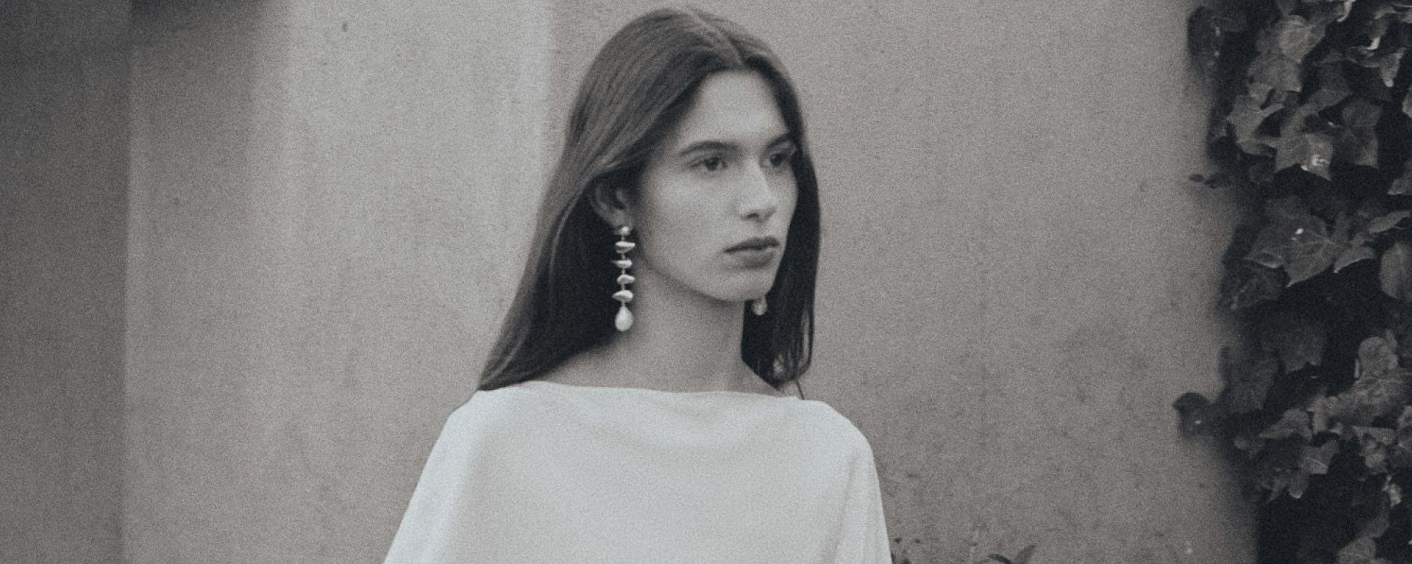 AGMES 0.925 sterling silver drop pearl Elvira earrings.Woman wearing AGMES 0.925 sterling silver drop pearl Elvira earrings.